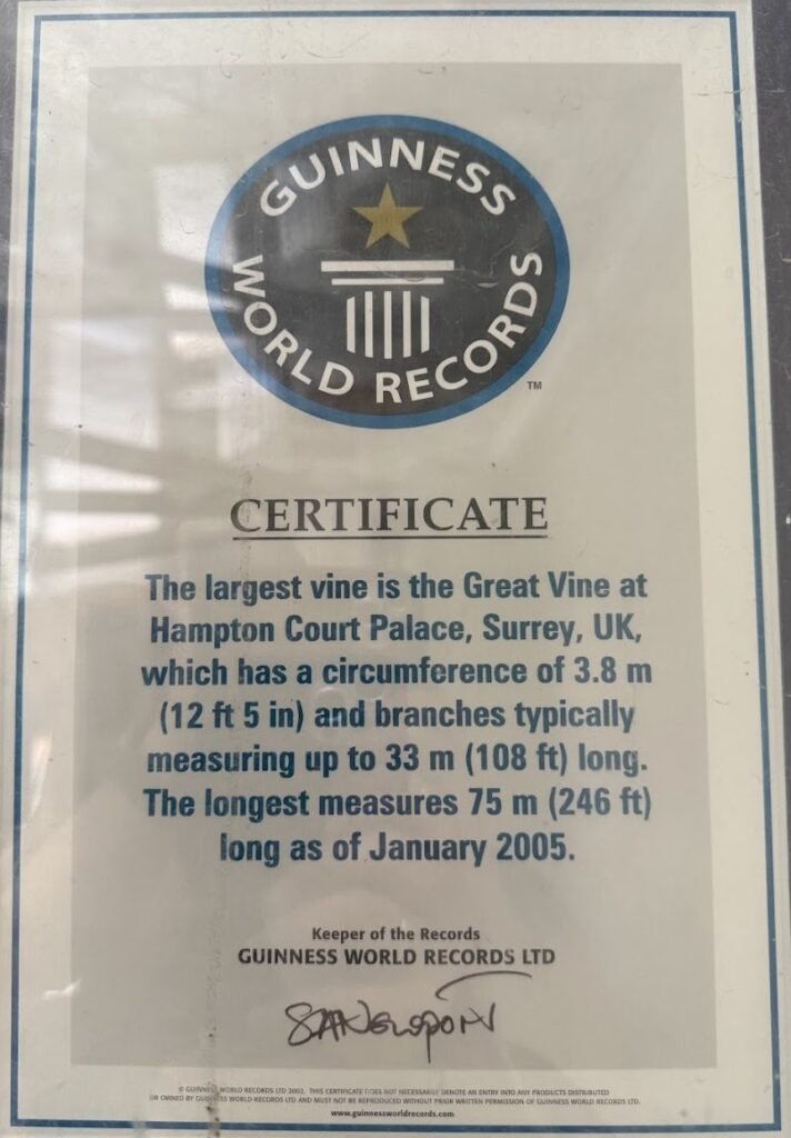 Ir vis dėlto, bene garsiausia šių sodų paslaptis – didžioji vynuogė. Ji buvo pasodinta 1768 m. karaliaus George III sodininko, legendinio Lancelot “Capability” Brown. Šis augalas iki šiol yra įrašytas į Gineso rekordų knygą kaip didžiausia pasaulyje vynuogė. Jos šaknys driekiasi dešimtis metrų, o derlius kasmet nuimamas ir iš jo gaminamas vynas, patiekiamas ant karališkos šeimos stalo. Įsivaizduokite – ragauti šių uogų vyną yra tarsi prisiliesti prie kelių šimtmečių istorijos.